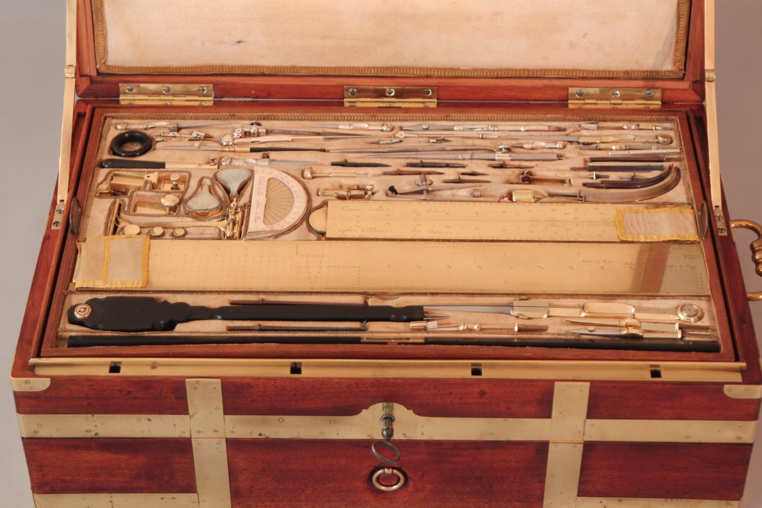Le coffre d’architecte époustouflant aux armes de Charles Pierre CLARET DE FLEURIEU, officier de marine, ministre de la marine et des colonies du roi Louis XVI, Intendant général de la Maison de l’Empereur, Gouverneur des Tuileries et du Louvre, finalement honoré par Napoléon qui l’ accompagnera lors de funérailles nationales dans sa dernière demeure : le Panthéon.