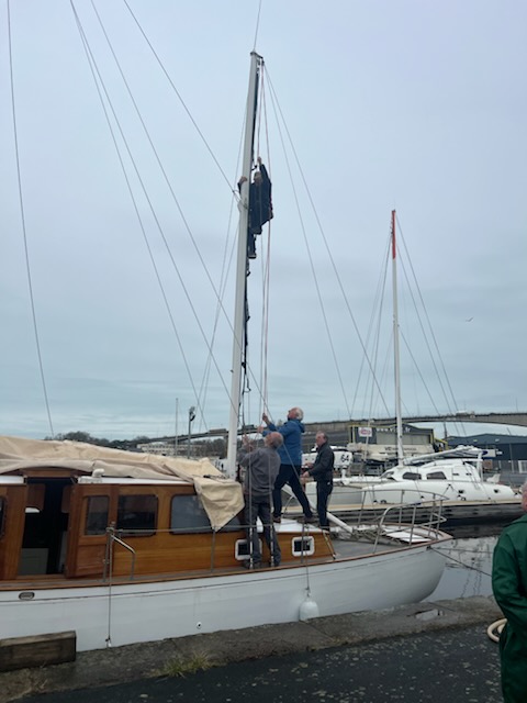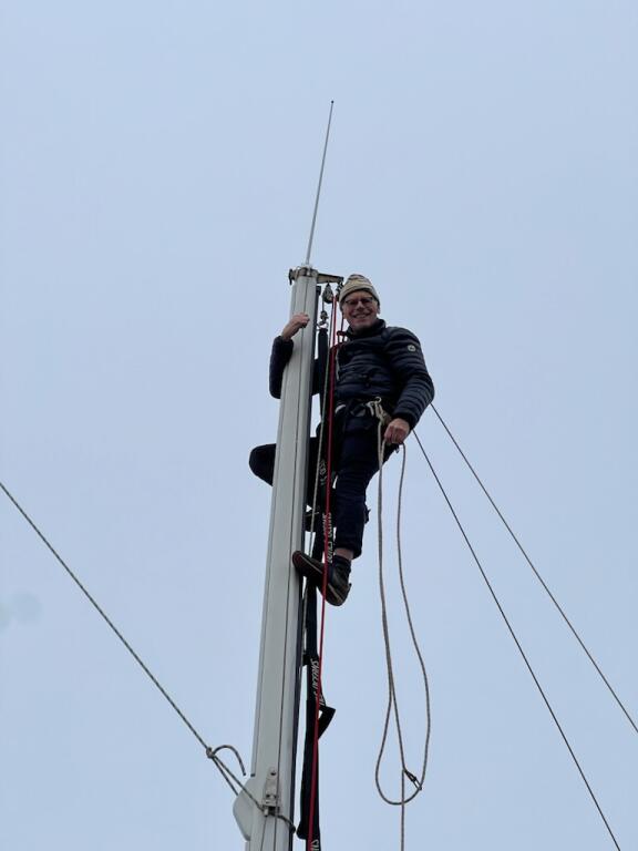 La saison, si on peut dire, a commencé, par la mise en forme du navire : entretien annuel du moteur, une peinture sous-marine, et des œuvres mortes. Peinture qui est refaite chaque année, ce qui permet à Gullveig de conserver sa superbe habituelle. Cette mise en forme qui cette année s’est accompagnée de la remise en état du cale pieds bâbord arrière : réparation des deux mètres explosés lorsque notre bateau a été heurté assez violemment par un Carter 37 lors la Belle Plaisance 2024. Travail effectué par Sébastien, du chantier DARAK à Combrit, mais aussi responsable de l’Hôtel pour voiliers classiques installé à St Guénolé, en plein pays Bigouden pour l’entretien et la restauration des bateaux de la « Team Fife » (Mariquita, Moonbeam III, Moonbeam IV, ou encore Avatar ou Ierne).