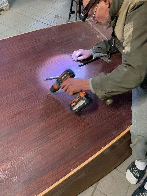 Ce travail a été accompli par Anne Blanes, charpentière de Marine, François Lecorre, Jean-Claude Le Chevallier, Hubert Carré et Jean-Daniel Aye. Nous sommes maintenant au niveau des finitions, ce qui n’est pas le moins prenant.