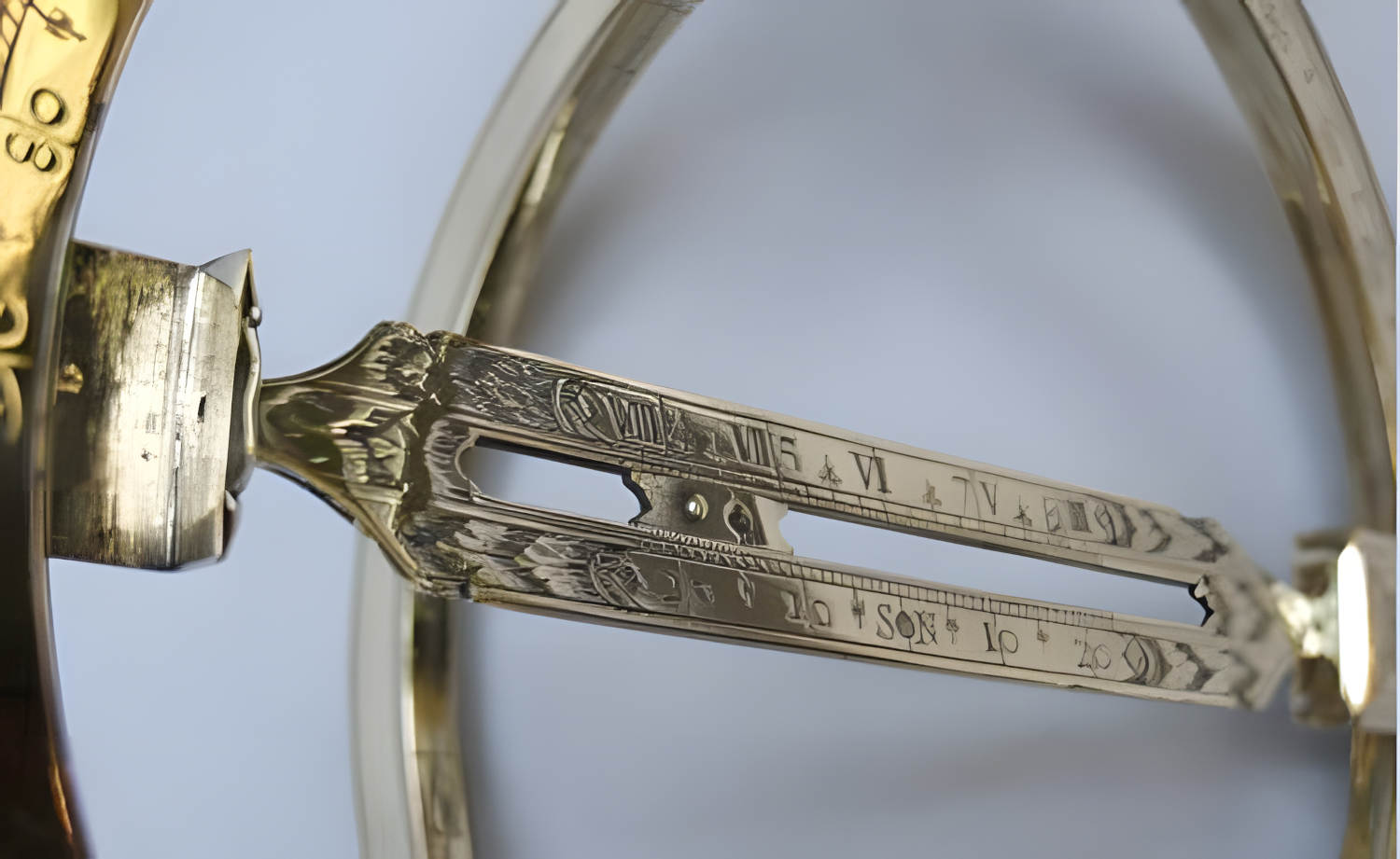 Un petit trou dans la pinnule laisse passer la lumière du soleil sur l’anneau central qui est le cercle des heures et que l’on a préalablement rabattu à la perpendiculaire (plan de l’équateur).