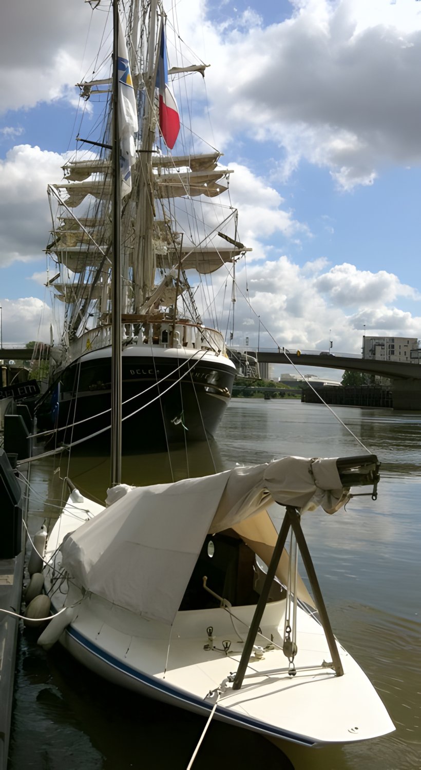 Cet unique survivant de notre ancienne flotte marchande fut construit à Nantes à la fin du 19e siècle, et comment ne pas le rapprocher de ce trois-mâts américain, également de couleur noire, en heureux contraste avec les installations portuaires et immeubles qui forment l’arrière-plan.