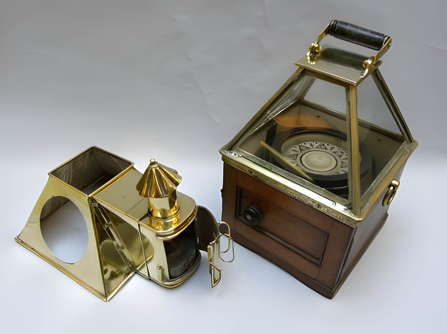 Dans le même temps, un système d’éclairage, au départ à la bougie, permettait la lecture de nuit. La déviation qui restait peu sensible sur les bateaux en bois devint indispensable sur les navires en acier d’où la compensation nécessaire avec des aimants permanents et les boules de fer doux, verte et rouge, qui agrémentent joliment les habitacles modernes.