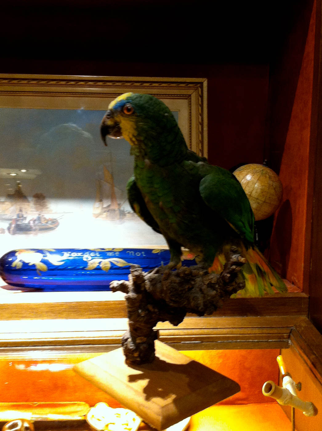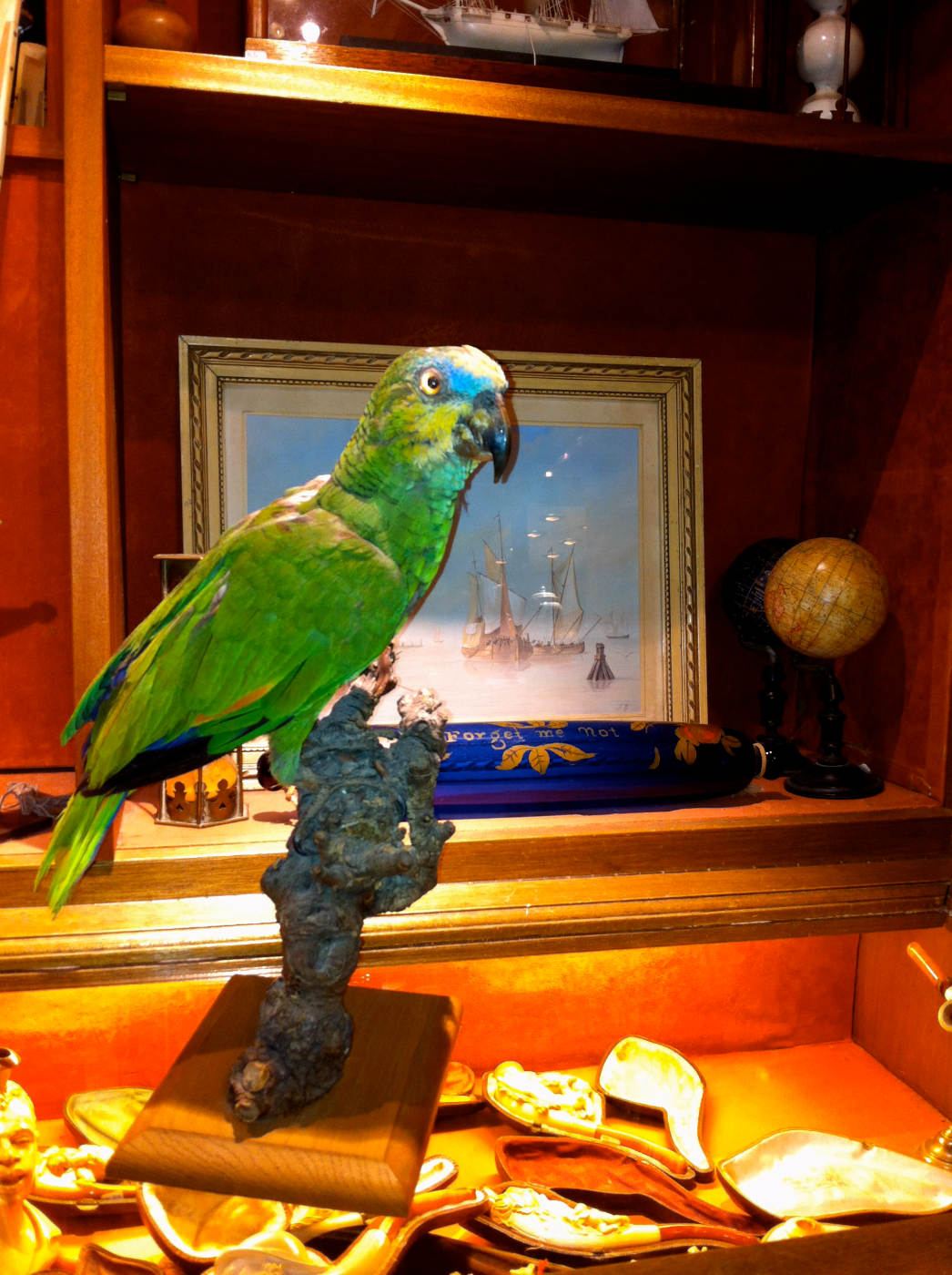 Le perroquet d’ Amazonie. Maintenant protégé, le perroquet d’Amazonie à front bleu, fit longtemps partie des souvenirs que les navigateurs rapportaient des iles. Cet oiseau a toujours fasciné les hommes, les marins, les artistes. Nous nous rappelons, avec une certaine émotion, de cette femme, fille de marin, qui dans notre galerie, les larmes aux yeux,,évoquait sa vie avec son perroquet, véritable compagnon dont elle prétendait qu’il était, de loin et de tous, le plus intelligent sur terre. Libre dans la maison où il voletait à son gré, il avait coutume de se poser sur son épaule. Elle était écrivain et elle avait l’impression qu’il pouvait lire … Tout au long de ces décennies passées ensemble, elle affirme avoir eu avec lui des conversations raisonnées, voire intimes. La symbiose était totale, au point d’y sacrifier ses week-ends car il était inenvisageable de l’abandonner ! Son « cousin » silencieux, le perroquet des Delalande, est la mascotte de la galerie. Il faisait déjà partie du décor au Grand Palais à la Biennale des Antiquaires en 1988. Continuant à leur porter chance, il va bientôt « s’envoler » en mars prochain pour Maastricht, au salon des antiquaires, la Tefaf, dans leur « cabinet de curiosités » ou ils prendront bien soin , il y sera merveilleusement entouré.