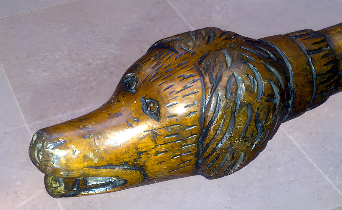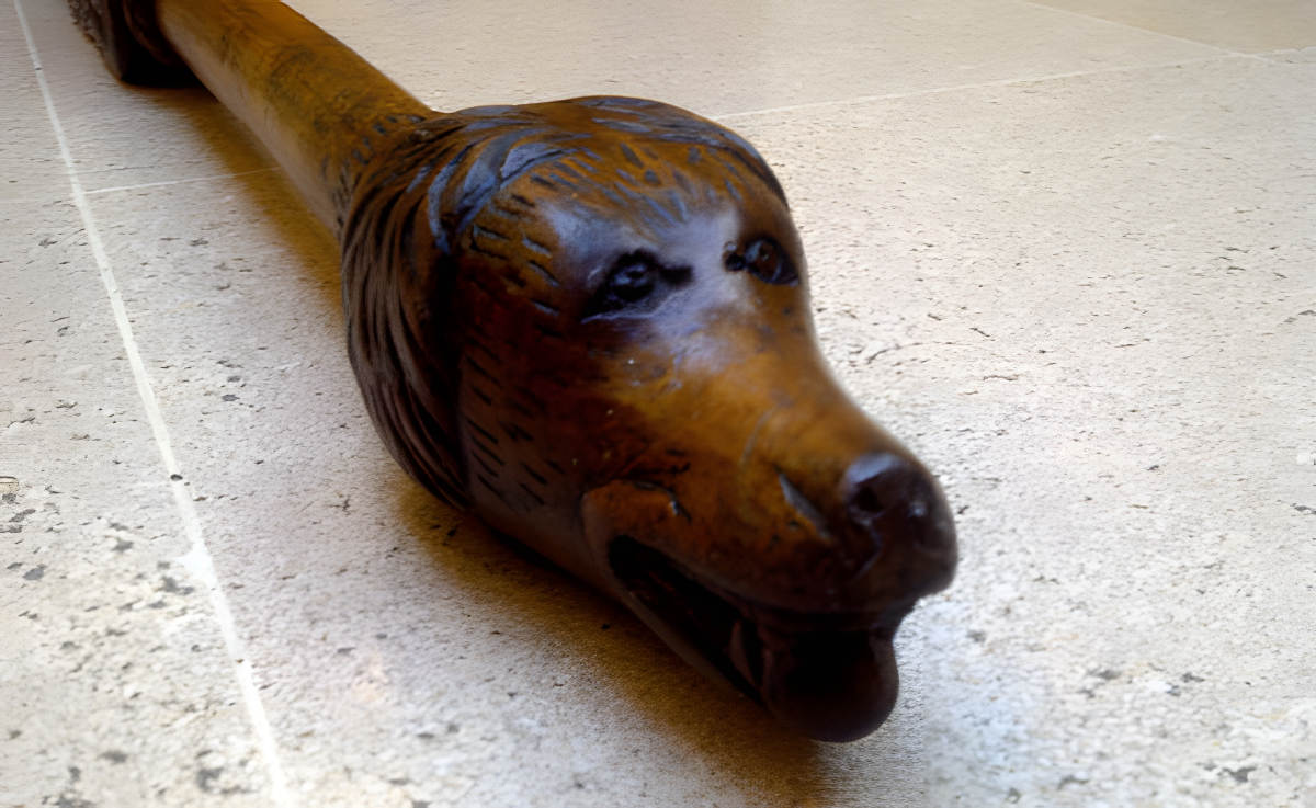 Les photos ci jointes en sont un bon exemple avec cette barre en chêne sculpté de motifs divers et d’ une tête de chien pour la prise en main.