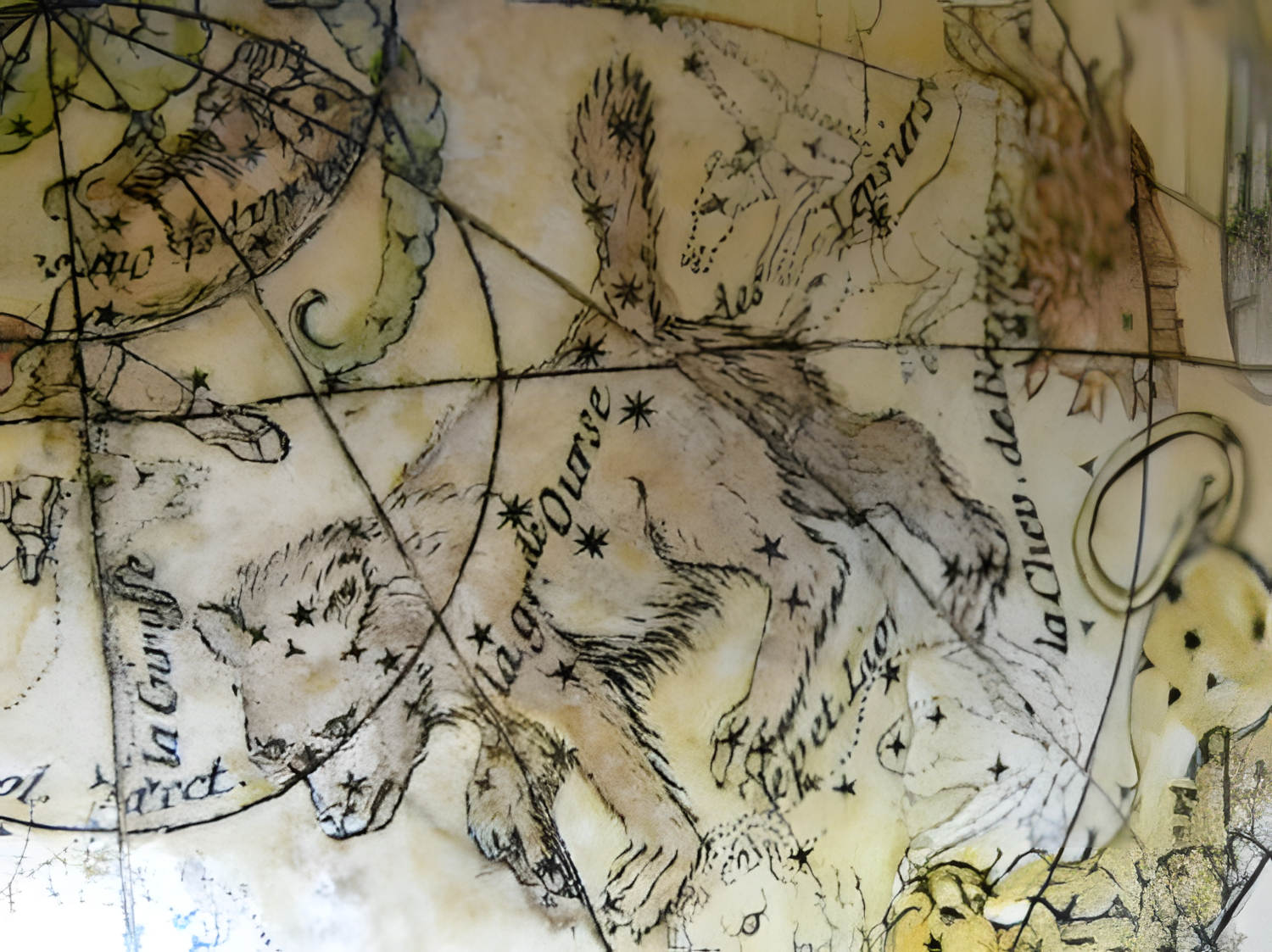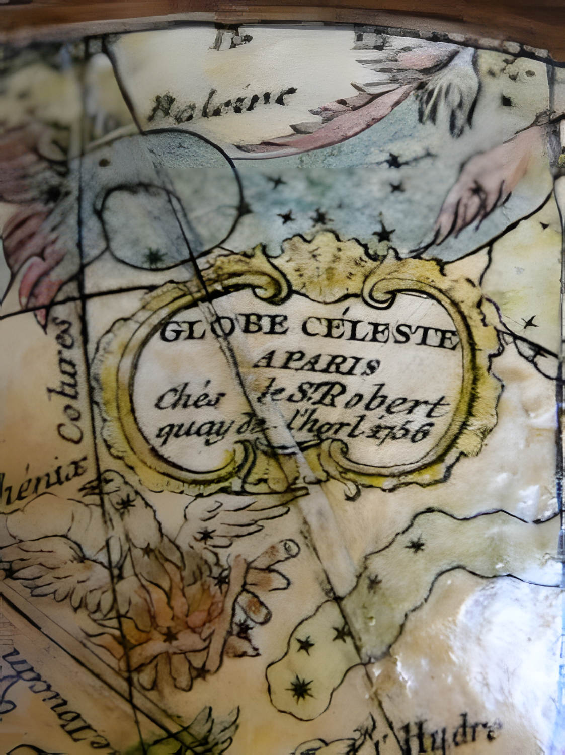 Il est recouvert de maroquin, le globe céleste constitue évidemment le revêtement intérieur de l’ écrin. Ce dernier protégeant le globe terrestre.