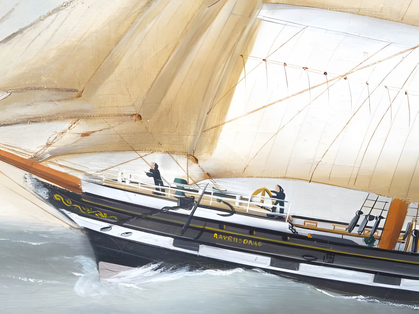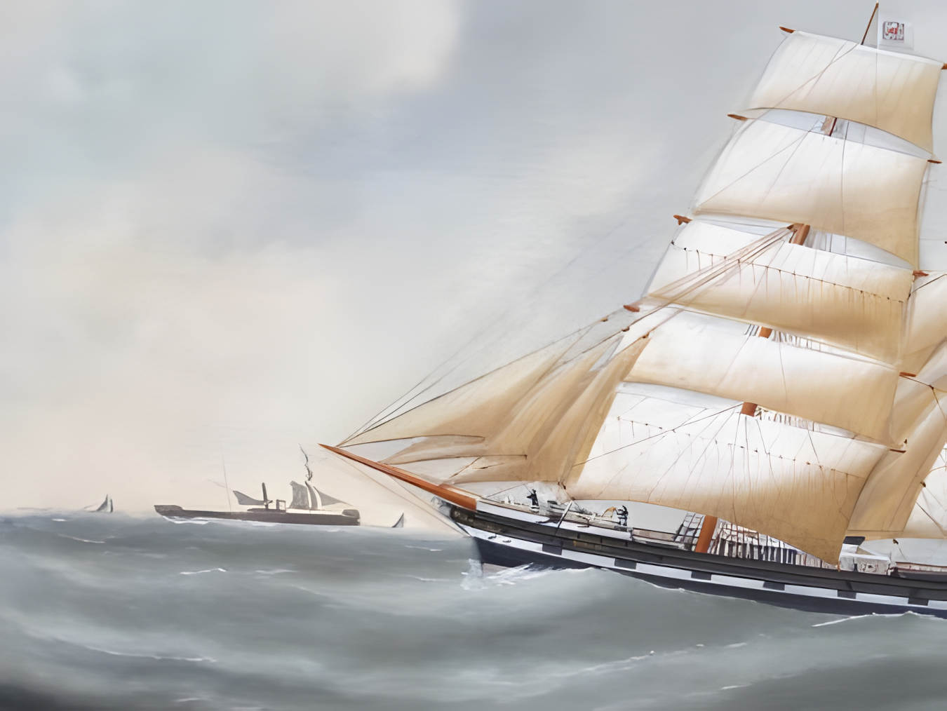 Trois bateaux dont un à vapeur navigant à l’horizon. Six marins à poste pour la navigation.
