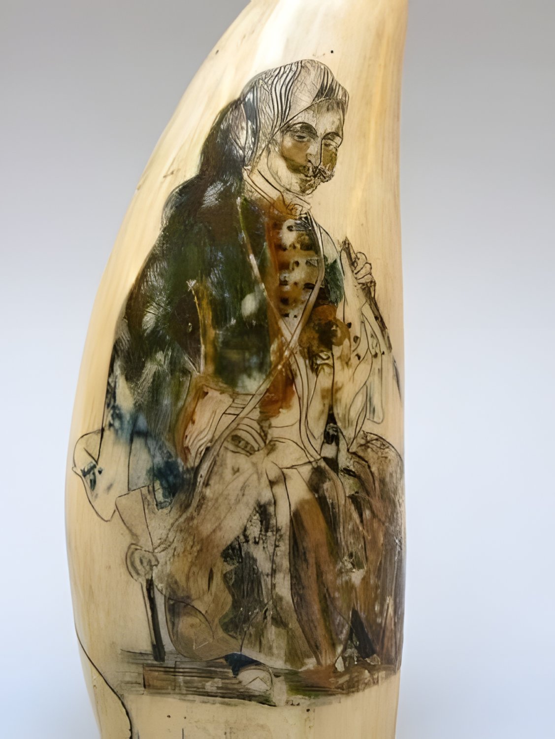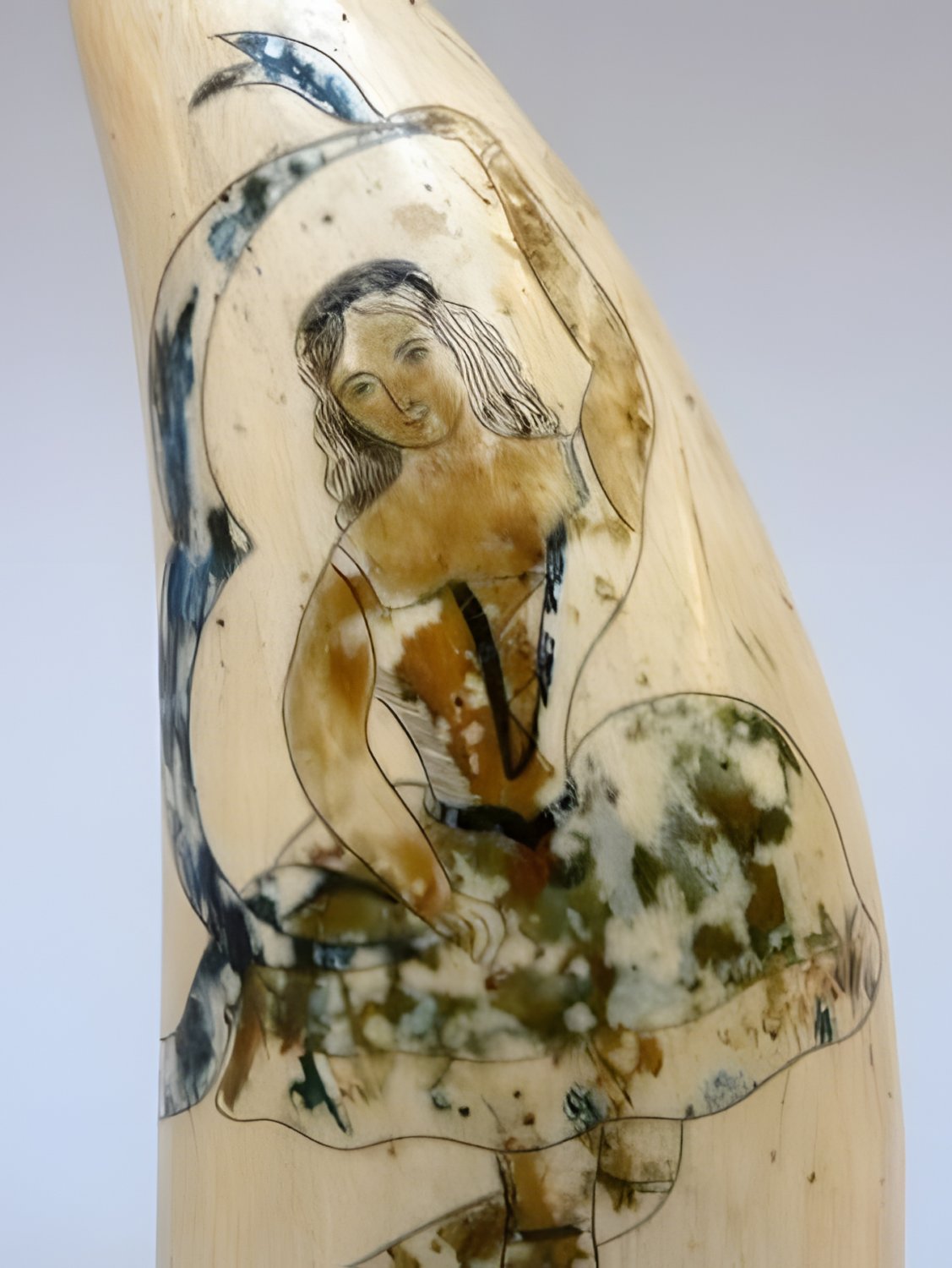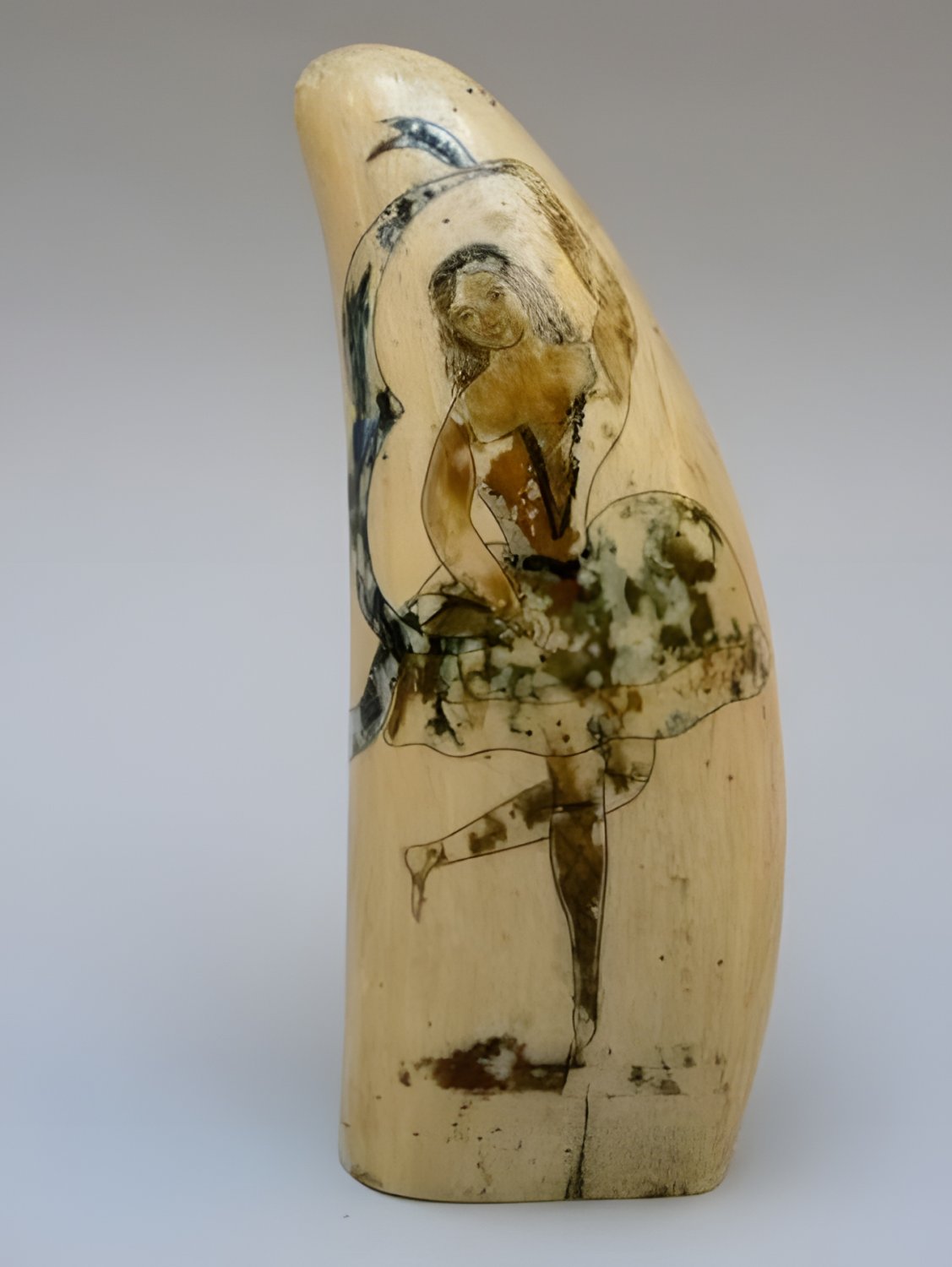 Une paire de scrimshaws : Deux dents de cachalot en polychromie peintes l’une d’un pirate barbaresque enturbanné et l’autre d’une danseuse de cabaret légèrement vêtue.