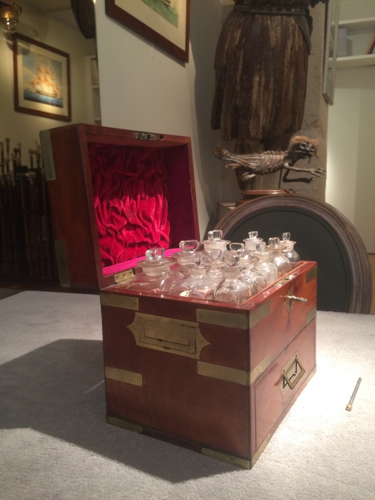 Cette pharmacie de bord, ancienne, complète et en parfait état de conservation a été conçue en Angleterre au tout début du 19e siécle. Cet objet précieux est représentatif de la méticulosité que l’on apportait à l’époque, à la fabrication de tous les ouvrages à caractère scientifique. Les matériaux utilisés répondent à ces mêmes critères, ainsi les bouchons des flacons sont en buis tourné.