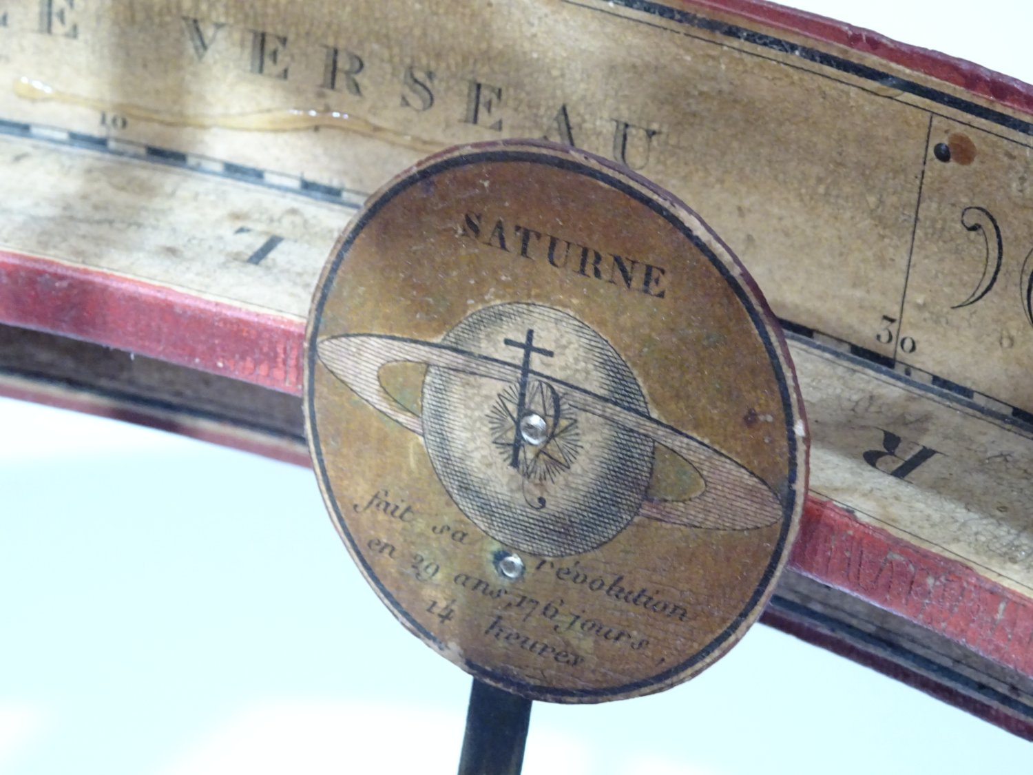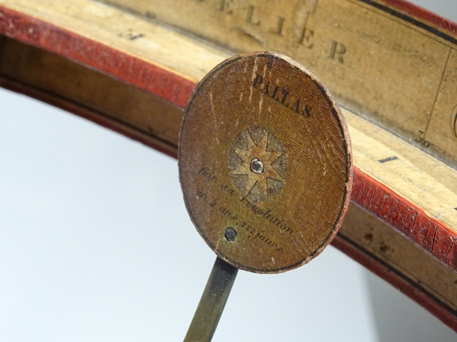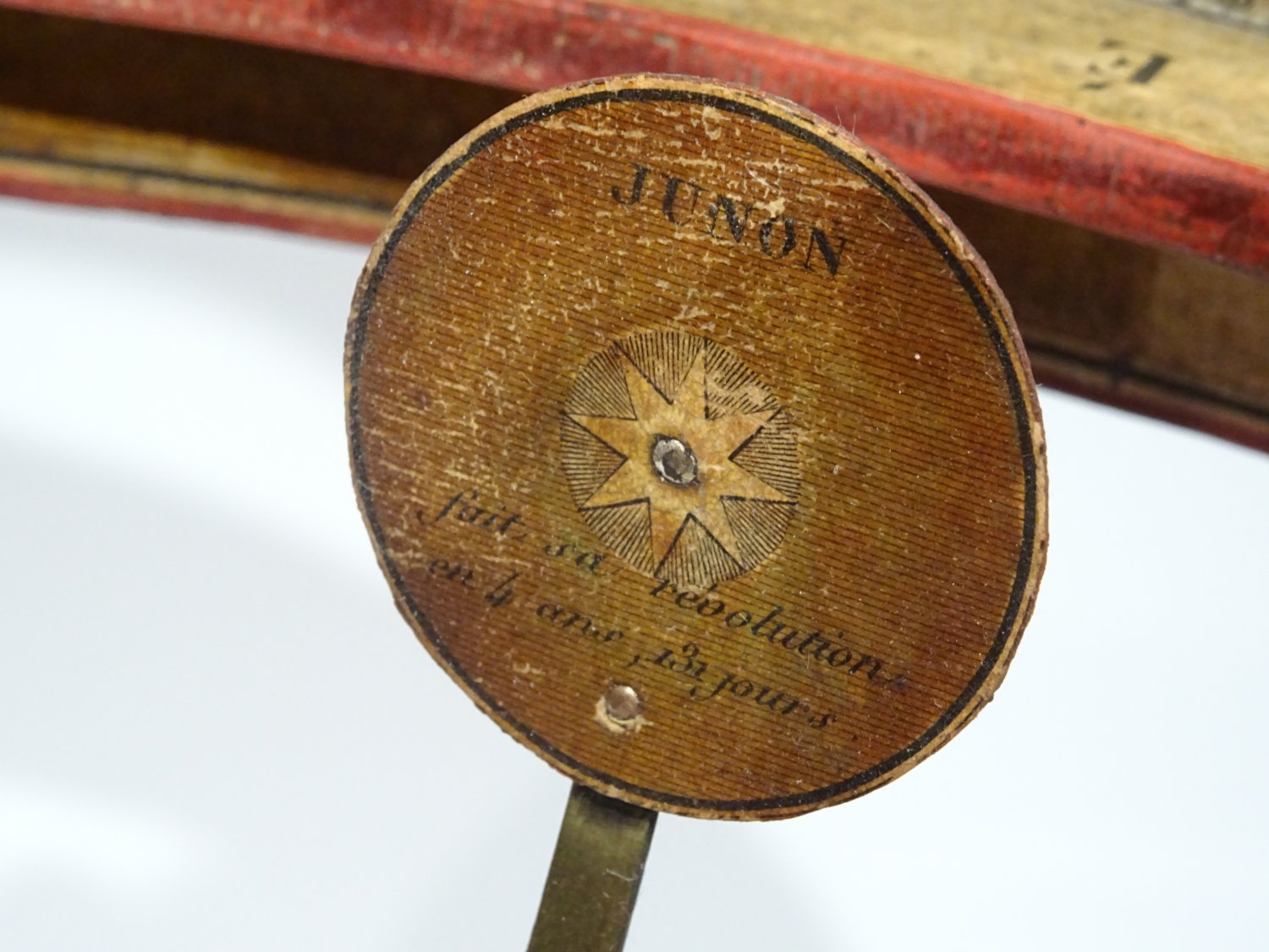 Bien qu’il ne soit pas signé, nous attribuons, sans hésitation, ce planétaire à Charles François Delamarche à Paris. L’astéroïde Vesta découvert en 1807 n’y figure pas, raison supplémentaire pour envisager sa datation entre 1802 et 1806.