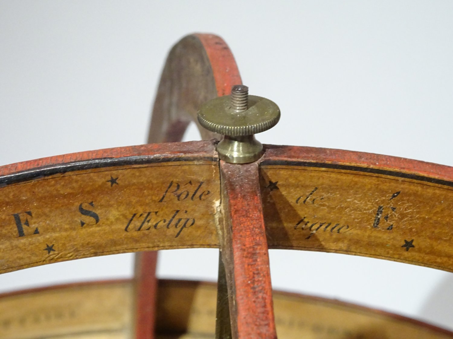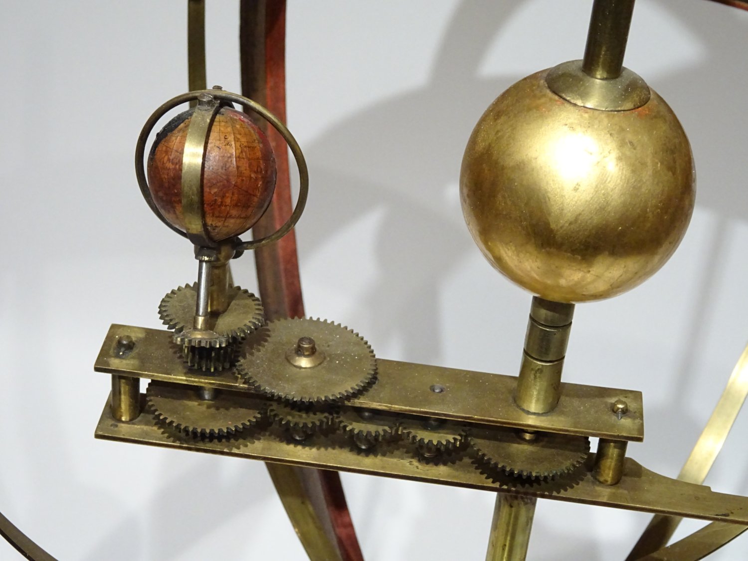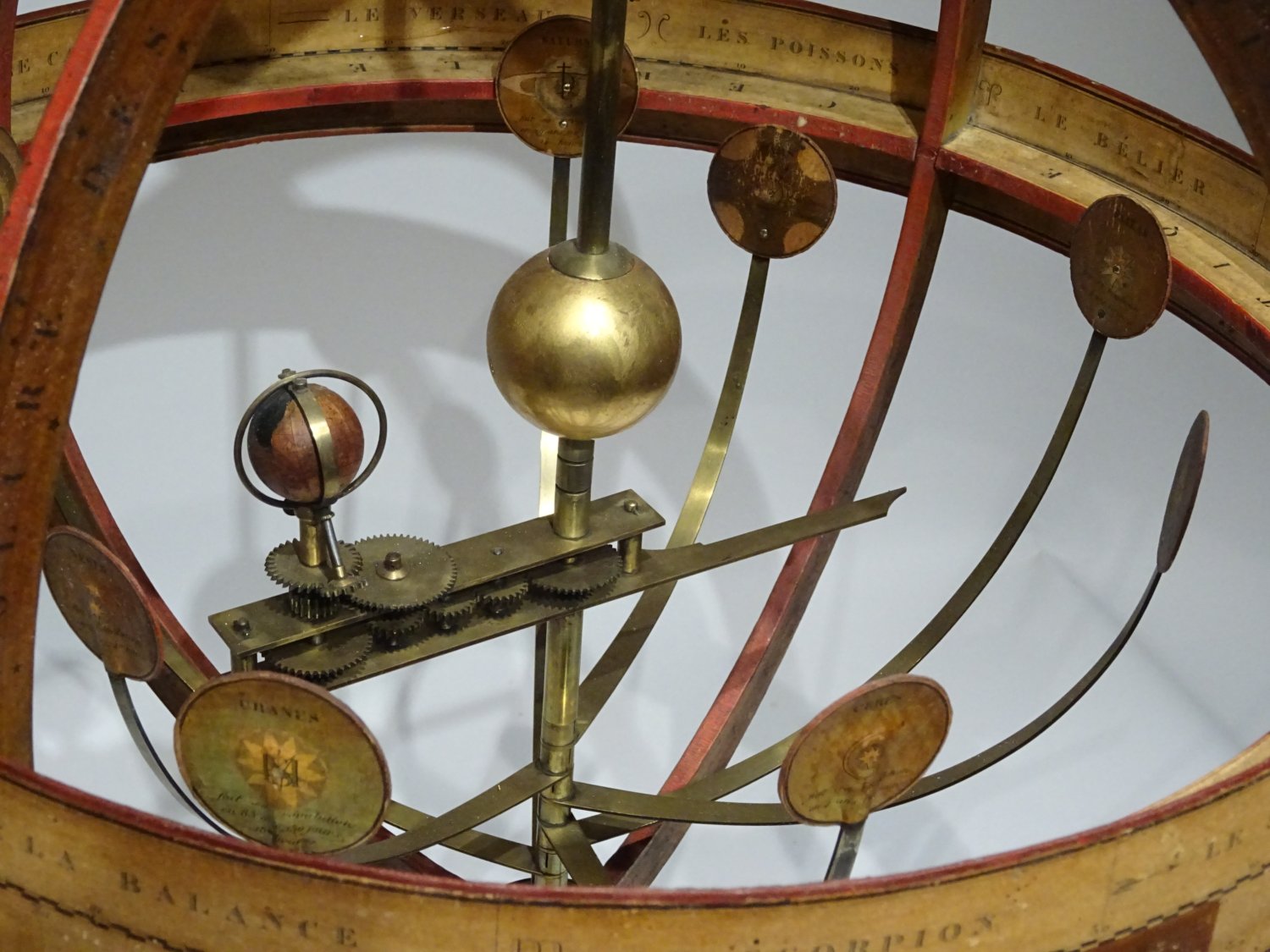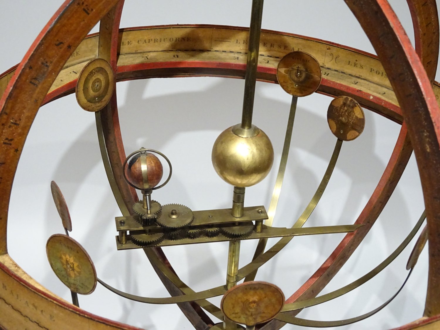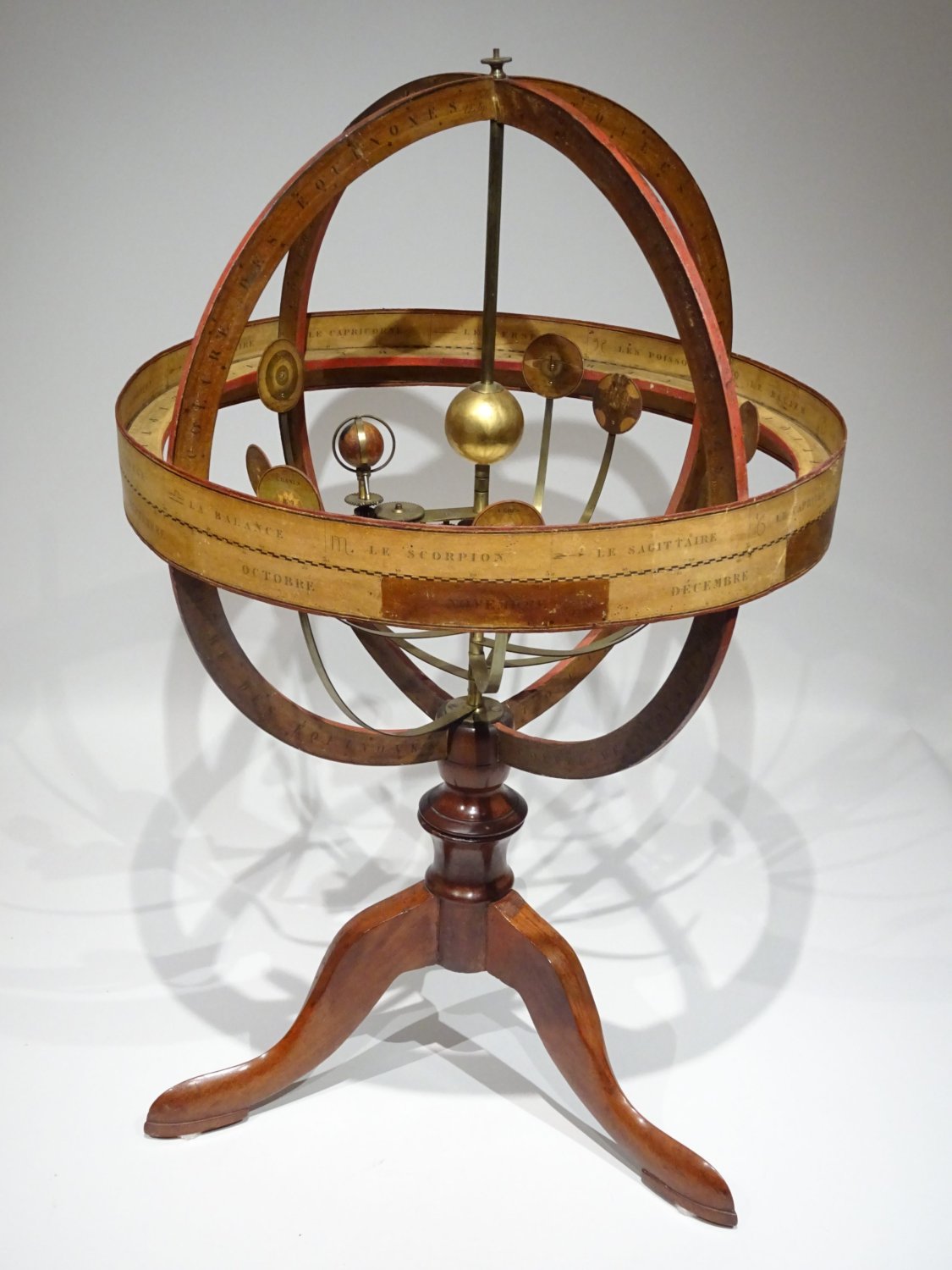 Qu’ils soient de Cook ou de La Pérouse, les carnets de voyage sont très suivis par les élites de l’époque qui éprouvent un intérêt croissant pour les passionnants récits de ces expéditions lointaines. Il s’agit aussi de le montrer et il devient bienséant d’exhiber un globe terrestre dans son cabinet ou son salon. Y sont, par contre, beaucoup moins fréquents les globes représentant la voûte céleste qui semblent plutôt réservés à quelques initiés. Mais l’astronomie européenne est en pleine effervescence et voilà qu’en quelques années sont découvertes Cérès (1801), Pallas (1802) et Junon (1804) … La mode est de plus en plus à la connaissance du ciel et les fabricants vont s’engouffrer dans ce nouveau marché en ajoutant aux terrestres des globes célestes pour les présenter en paires. Mais il y a mieux: on cherche de plus en plus à comprendre le mécanisme de cet univers presqu’angoissant qu’on est en train de découvrir… Le meilleur moyen d’expliquer ce mécanisme compliqué se fera avec l’apparition des sphères armillaires. Celle qui est illustrée ici en photo est de style copernicienavec le soleil au centre du système, comme dans la réalité. Tournant, sur une base tripode en acajou, le planétaire se meut sur un axe constitué d’une structure de deux anneaux verticaux (les colures des solstices et des équinoxes). Cette structure est entourée d’un anneau horizontal, le cercle de l’écliptique, paré d’un bandeau sur lequel sont reproduits les mois et les signes zodiacaux. Le Soleil, sous la forme d’une boule en laiton doré, se présente avec les planètes et astéroïdes qu’on lui connaît à l’époque: Mercure, Vénus, Mars, Junon, Cérès, Pallas, Jupiter, Saturne et Herschel (l’ancien nom d’Uranus). Ceux-ci sont matérialisés par des disques fixés sur des armilles en laiton. Une languette permet d’entraîner le mouvement de toutes les planètes en rotation autour du soleil et à leurs vitesses respectives. Dans le même temps la terre tourne autour d’elle-même grâce à un système de poulies à gorge formant Tellurium.