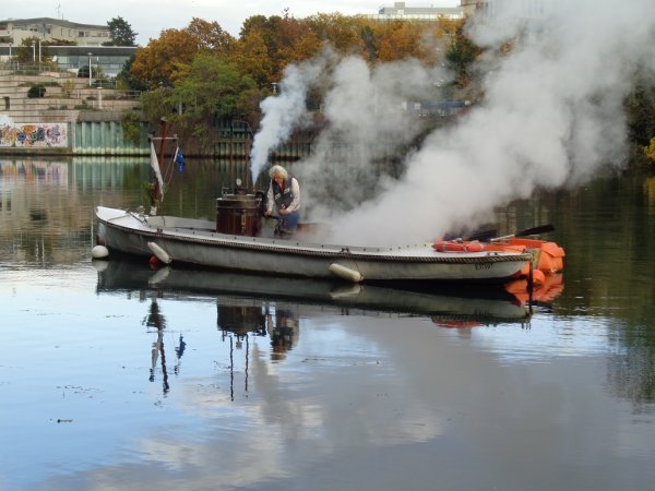 À 14h15, nous emmenons Vigie en amont de Sequana. À bord, Jean Blanchard à la barre, MAD à la machine, Joselyne à la chauffe et Jean-Marc aux manœuvres. Nous attendons le signal de départ pour cette « fausse arrivée » devant les officiels et les invités.
