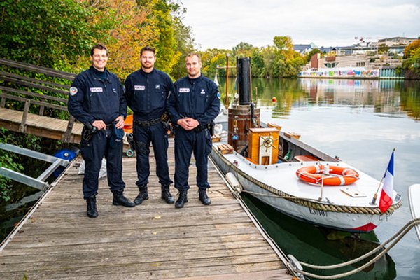 Une dernière photo entre collègues de la Brigade fluviale, sans oublier le photographe du Service Communication de la Préfecture de Police que nous remercions pour ses belles image et Vigie se repose et retrouve le corps mort.